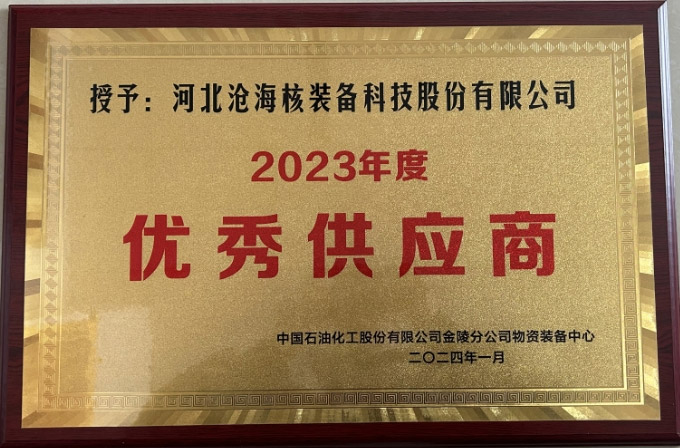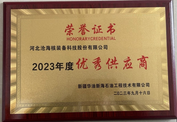 近日,河北滄海核裝備科技股份有限公司先后榮獲2023年度中國石油化工股份有限公司金陵分公司物資裝備中心、新疆華油新海石油工程技術(shù)有限公司頒發(fā)的“優(yōu) 秀供應(yīng)商”榮譽(yù)稱號(hào),為公司榮譽(yù)墻再添新彩。