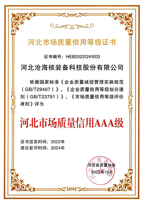 河北滄海河北市場質(zhì)量信用等級證書